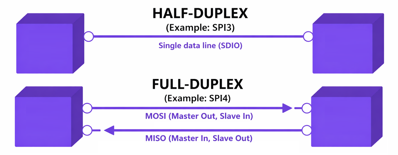 "Duplexing" refers to the establishment of a two-way communication between two nodes. Conventionally, digital copperline protocols were classified as "half-duplex" where the same wire is shared on the basis of taking turns, and "full-duplex" where two dedicated wires are used.