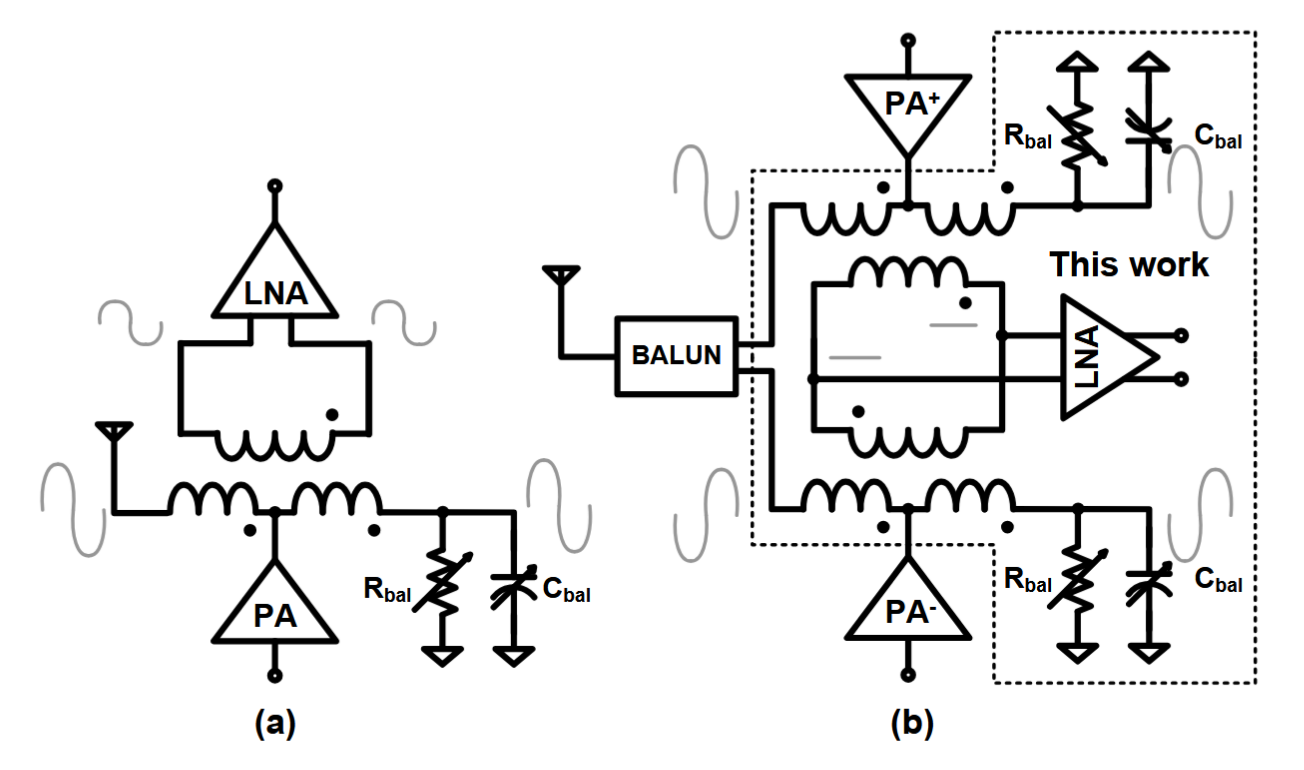 The concept of using a transformer to cancel out common-mode signals dates all the way back to 1968 [7]. Well, who would've thought that this would make a comeback in 2009! It did when Prof. Abidi (UCLA) and collaborators [8] showed that this concept can be used to make a fully integrated duplexer. After this, researchers at UCSD [5], IMEC and KU Leuven [4, 6] further developed tunable on-chip duplexers. Their "hybrid transformer" duplexers essentially looked like these: