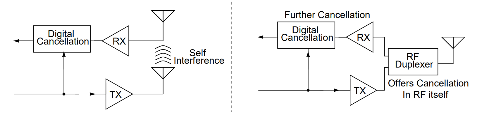 - Phased-Shifted Addition: A copy of the TX signal shifted by 180° in phase is added to the RX signal in the RF domain (on-chip), thereby cancelling the SI.